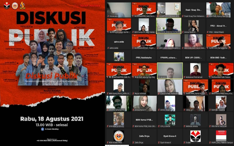 PURWAKARTAUPDATE.com | BEM KEMA FPEB UPI menggelar diskusi publik bertajuk “Menelisik Enigma Biaya Pendidikan di Kampus Pendidikan”, pada Rabu (18/8/2021), yang dilatarbelakangi oleh problematika yang sedang terjadi di kampus Universitas Pendidikan Indonesia salahsatunya tentang permasalahan Uang Kuliah Tunggal (UKT).