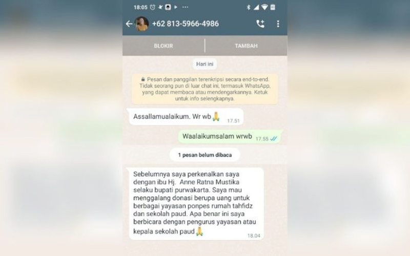 Awalnya, kata Wilyanto, nomor dengan foto profil Bupati Purwakarta itu basa-basi menanyakan kabar hingga ingin memberikan donasi.