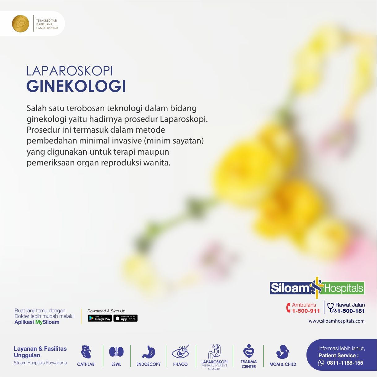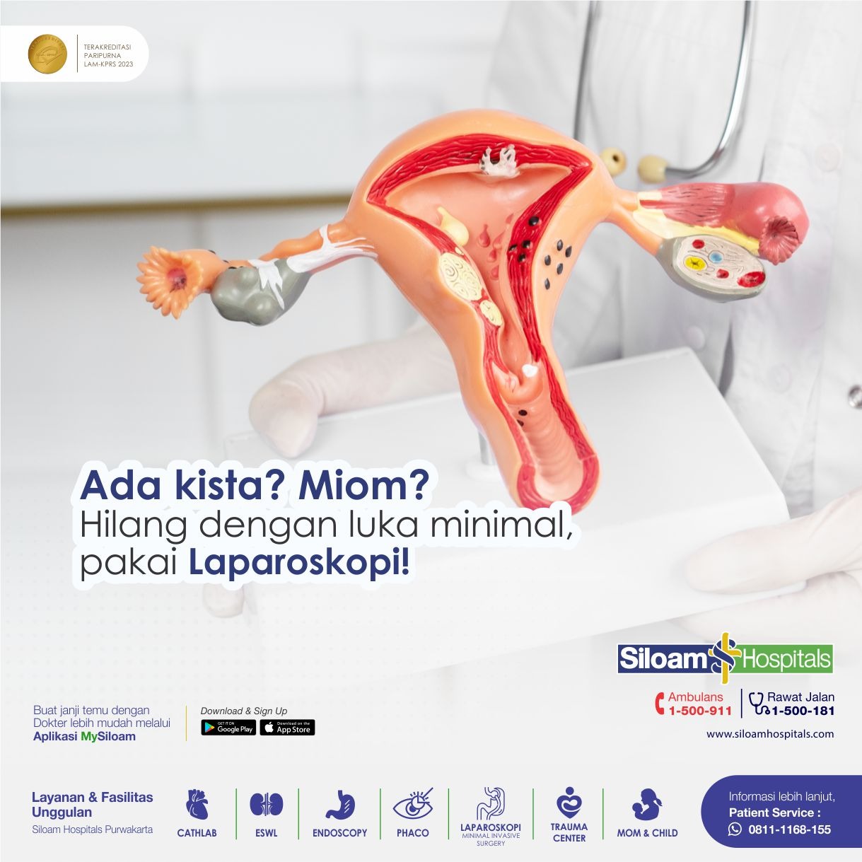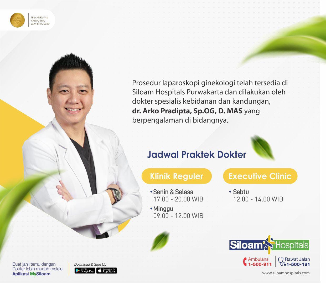 Prosedur laparoskopi ginekologi telah tersedia di Siloam Hospitals Purwakarta dan dilakukan oleh dokter spesialis kebidanan dan kandungan, dr. Arko Pradipta, Sp.OG, D.MAS yang berpengalaman di bidangnya.