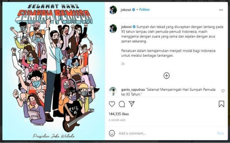 Dalam unggahannya di Instagram, Presiden menyertakan sebuah gambar ucapan Selamat Hari Sumpah Pemuda, dengan ilustrasi gambar Presiden bersama para pemuda dari beragam latar belakang, mulai dari pelajar, dokter, atlet, musisi, juru masak, termasuk juga penyandang disabilitas.***
