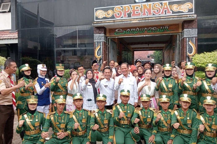 Menteri Lingkungan Hidup dan Kehutanan RI Dr. Hanif Faisol Nurofiq (tengah, berbaju putih) bersama Wakil Menteri LHK Diaz Hendropriyono, Bupati Purwakarta Saepul Bahri Binzein, Plt. Kepala Dinas Pendidikan Purwakarta Sadiyah, serta Kepala SMPN 1 Patoni berfoto bersama siswa dan guru SMP Negeri 1 Purwakarta usai meninjau karya ecobrick dalam peringatan Hari Kebangkitan Nasional, Selasa (3/6/2025).