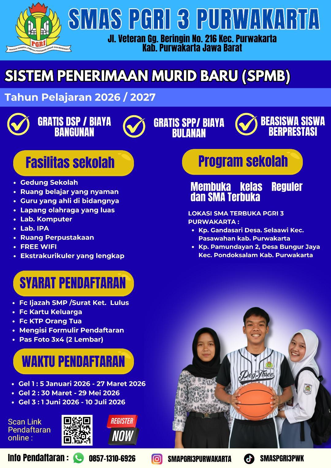 Purwakartaupdate.com, Purwakarta – Kabar baik bagi warga Purwakarta dan sekitarnya. Sistem Penerimaan Murid Baru (SPMB) SMAS PGRI 3 Purwakarta resmi dibuka untuk Tahun Ajaran 2026/2027. Sekolah ini membuka kesempatan bagi peserta didik baru maupun siswa pindahan.
