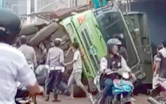 Kecelakaan Truk Terguling Menimpa Satu Motor Milik Warga di Jalan Pramuka Jatiluhur
