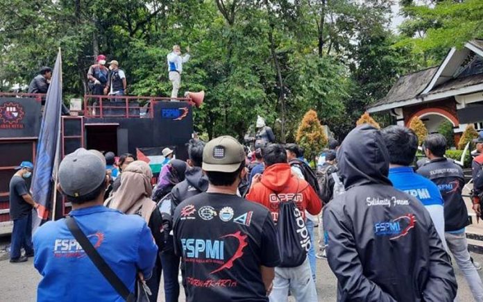 Purwakarta Update | Aksi unjuk rasa dilakukan ratusan buruh yang tergabung dalam Federasi serikat pekerja metal indonesia (FSPMI) di depan komplek Pemerintah Kabupaten (Pemkab) Purwakarta, pada Selasa, 26 Oktober 2021.