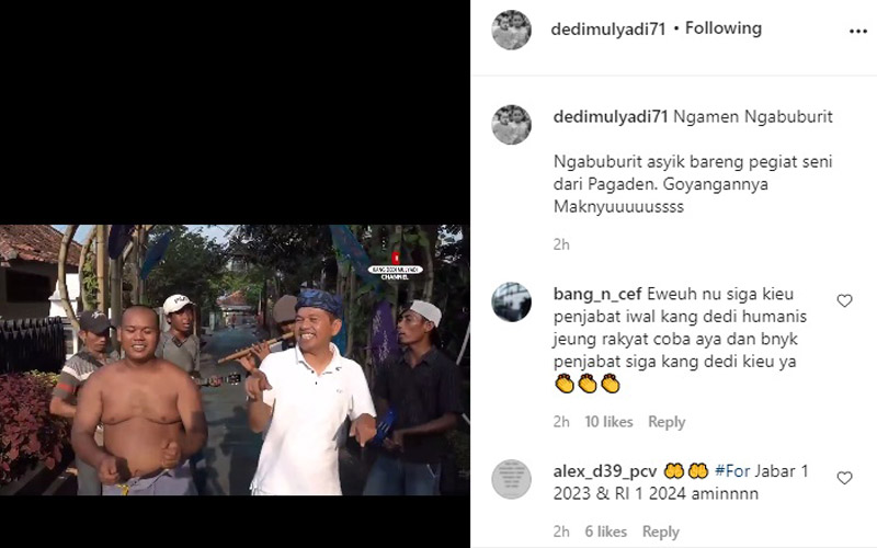 “Ngamen Ngabuburit, Ngabuburit asyik bareng pegiat seni dari Pagaden. Goyangannya Maknyuuuuussss,” ujar Dedi Mulyadi, dalam unggahan Instagramnya @Dedimulyadi71, Senin (3/5/2021).