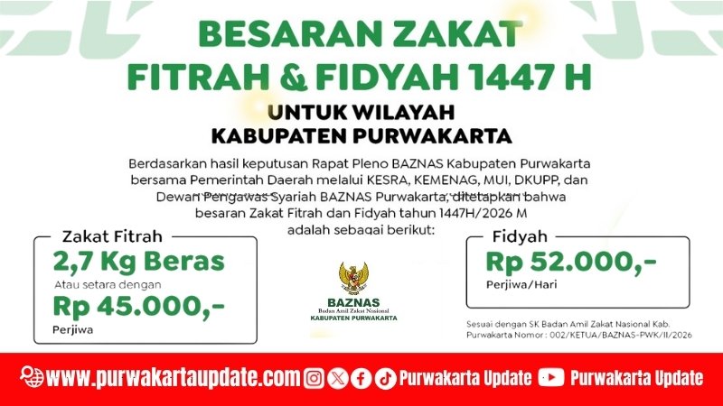 Purwakartaupdate.com, Purwakarta – Menjelang Ramadan 1447 Hijriah, Badan Amil Zakat Nasional (BAZNAS) Kabupaten Purwakarta resmi menetapkan besaran zakat fitrah dan fidyah yang berlaku bagi masyarakat Kabupaten Purwakarta. Informasi ini diterima redaksi pada Rabu (11/2/2026).