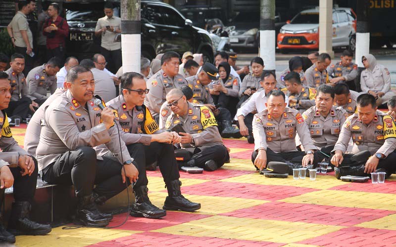 Terlihat, Kapolres Purwakarta, AKBP Lilik Ardiansyah duduk beraskan lantai dan aspal serta berbaur dengan anggotanya saat memberikan arahan dalam apel pagi, Pada Senin, 9 Desember 2024.