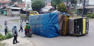 Truk Pengangkut Batu Bata Terguling di Tanjakan Pondoksalam Purwakarta